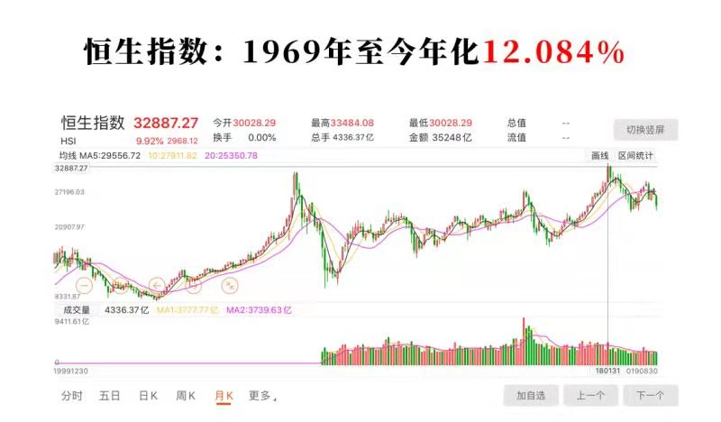 假如我们从 1964 年投资了恒生指数编制而成的基金,投资 10 万块钱,现在就能变成 2500 万元