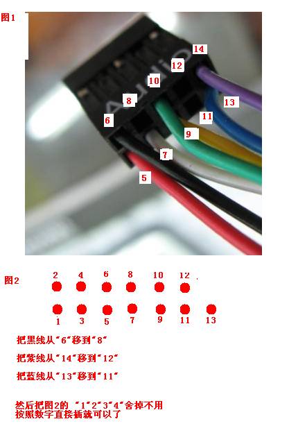 这是一个电脑前置USB的所有接线,还有一个USB跟上面的类同,只是将USB数据正、负线的名字中的数字加1,以示与第一个USB接口的区别。
