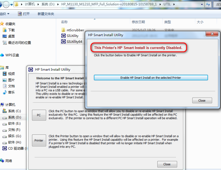 3、点击PC或者Printer选择打印机后,会显示当前是否已经打开智能安装(This Printer's HP Smart Install-is currently Enabled.),点击Disable HP Smart Install on the selected Printer;