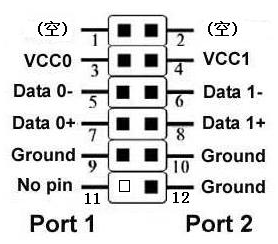 这是一个电脑前置USB的所有接线,还有一个USB跟上面的类同,只是将USB数据正、负线的名字中的数字加1,以示与第一个USB接口的区别。