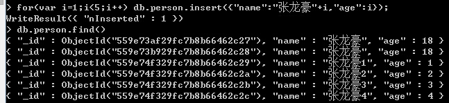 Note:这里我主要用啦一个for语法,循环插入啦4条数据,是不是有点小激动。哈哈,mongodb就是这么任性。