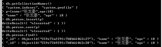 > show collections --查看数据库中有那些个集合(表)