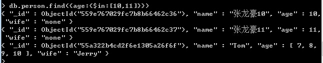 1、{age:{$in:[10,11]}}:如果age是数组的话,只要数组包含in中条件的任何一条数据,都能被检索出来。不是数组,则只要满足in中的任何一个条件数据,也可以被检索出来。